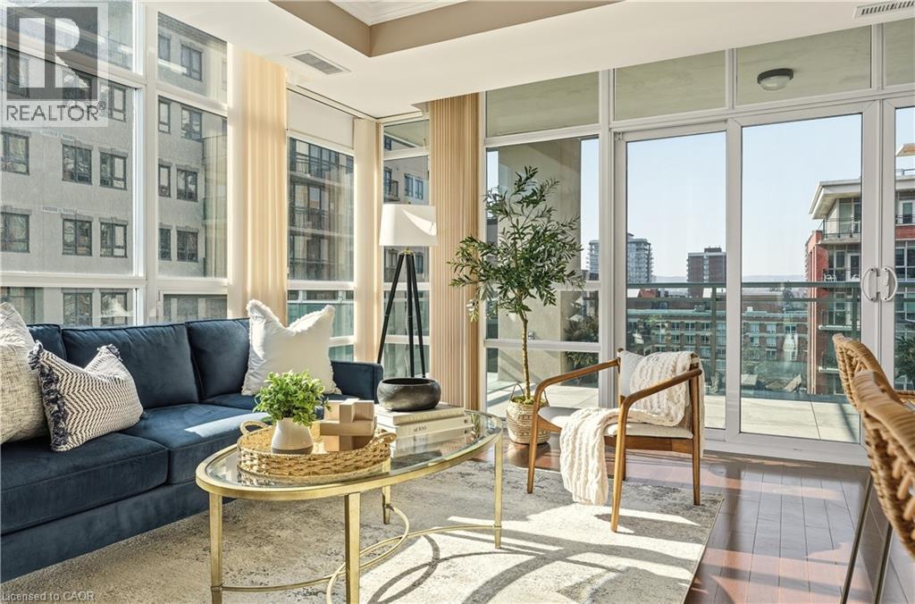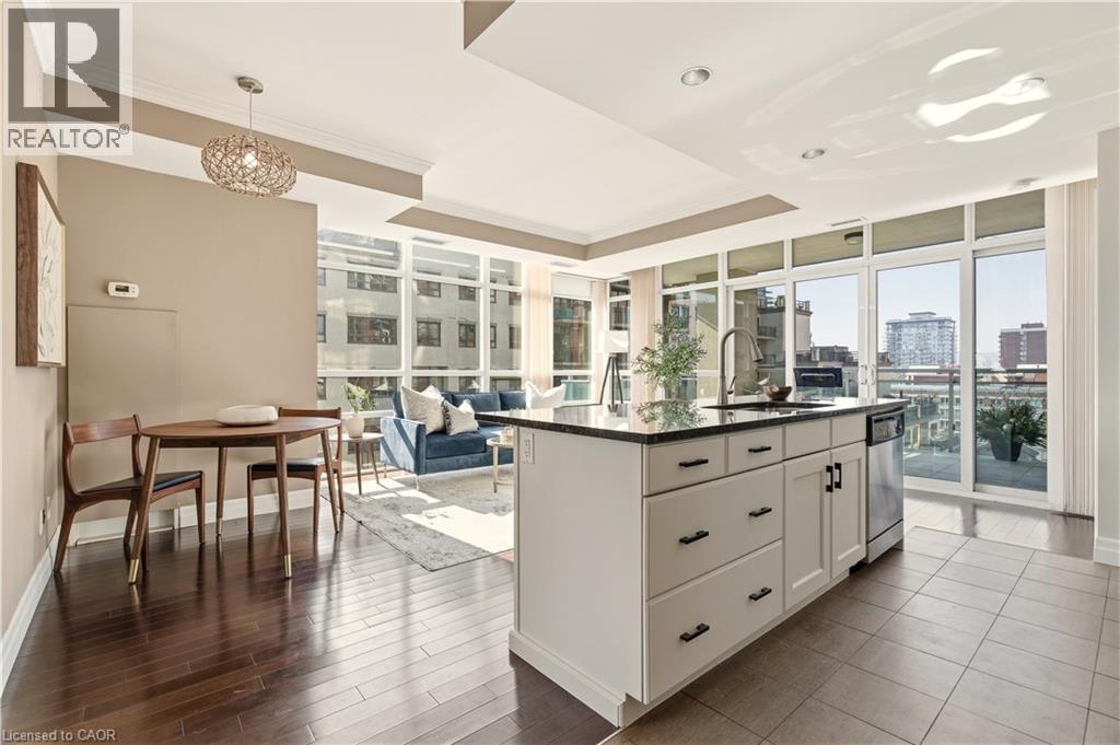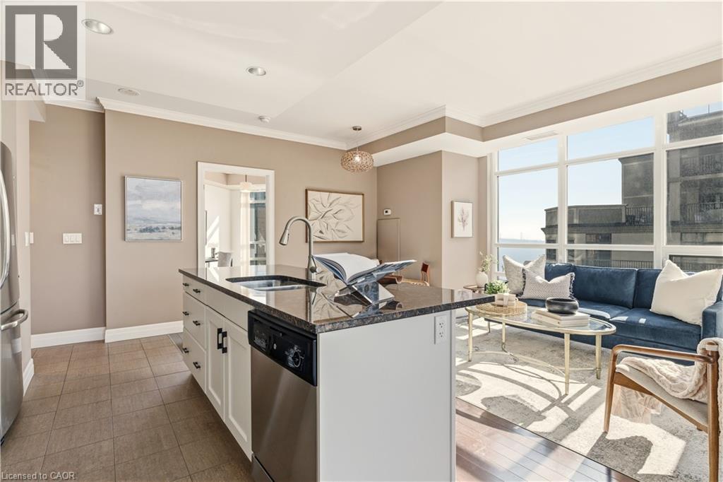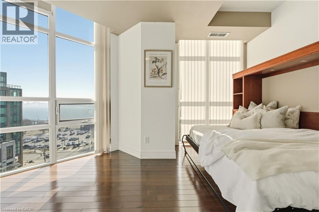Welcome to the highly sought-after 360 Pearl—a premier building in the heart of downtown Burlington with gorgeous lake and escarpment views in every direction. This beautifully updated 2-bed, 2-bath suite offers an open-concept layout, floor-to-ceiling windows, and 9 ft ceilings, creating a bright and sophisticated living space. The kitchen impresses with custom cabinetry, pot drawers and slide-out shelving, stainless steel appliances which include a gas stove, a generous island for entertaining, and granite countertops. The Great Room is wrapped in windows, showcasing lake views and providing a seamless walkout to your expansive wrap-around balcony. The primary suite offers its own balcony access, a spacious walk-in closet with built-in organizers, and a spa-inspired ensuite with a large glass shower and extended vanity. The second bedroom features stunning lake views and a custom Murphy bed—perfect for easily transitioning between a home office and guest space. A stylish 4-piece bathroom with granite finishes and convenient in-suite laundry complete the interior. This unit truly shines for those who love to entertain. The building offers exceptional amenities including a rooftop terrace with BBQs, state-of-the-art gym with a steam room, party room, games room, movie theatre, and 24-hour concierge/security. Walk to Burlington’s best restaurants, boutique shops, Spencer Smith Park, and waterfront events. Includes 1 parking space (Level B #4) and 1 locker (Level B #57) (id:4069)